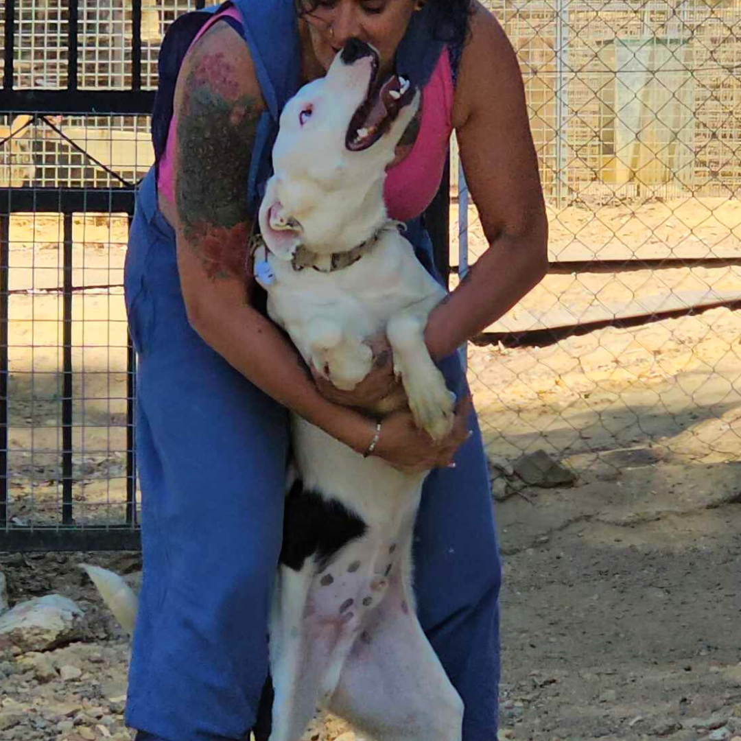 A Suker hanno tagliato le orecchie in maniera barbara, non sappiamo cosa gli sia capitato, ma il suo corpo porta i segni di un passato terribile. Nonostante questo è affettuoso, allegro e socievoe. Ha un problema di udito, reagisce al fischietto, ma non a tutti i suoni con i quali è stato testato.