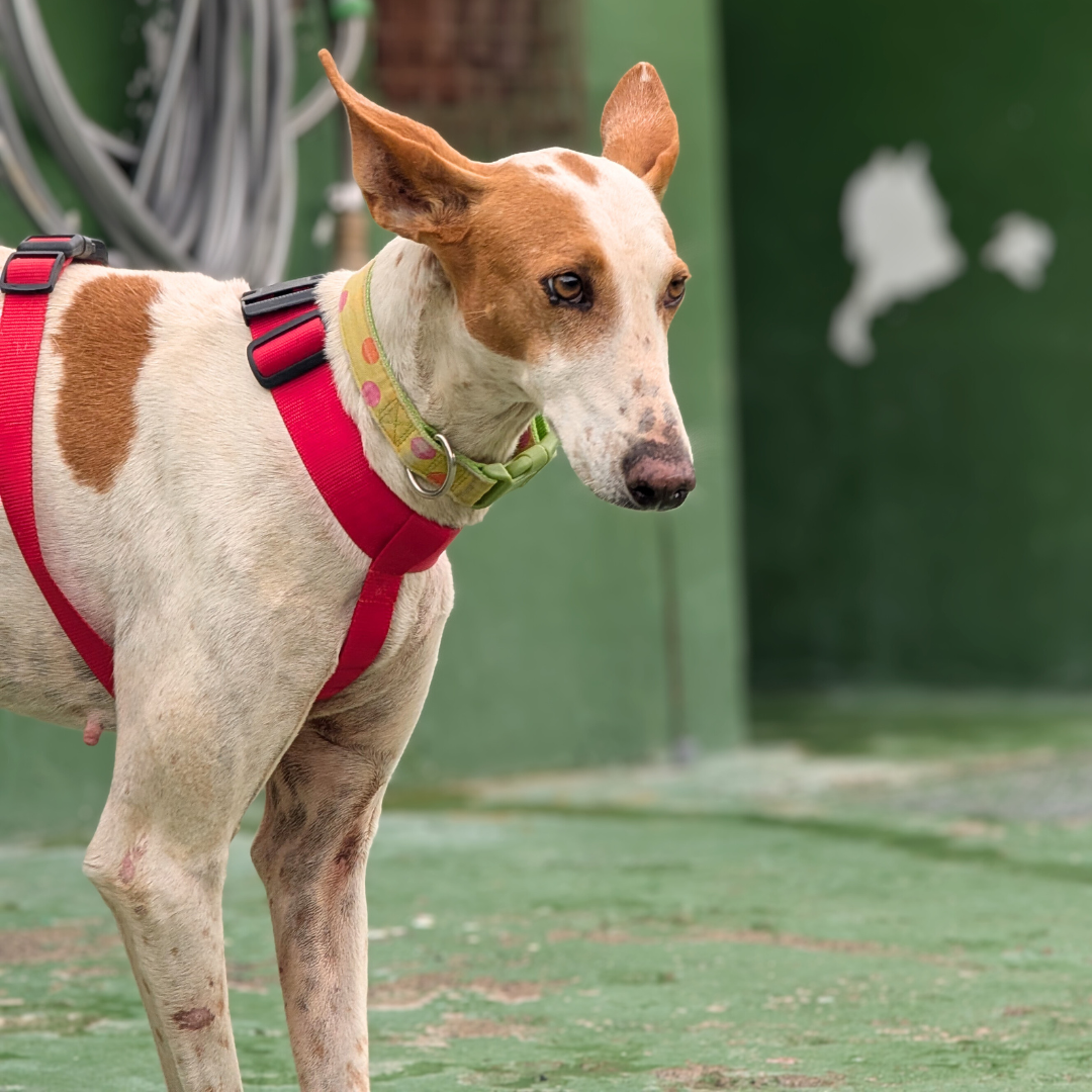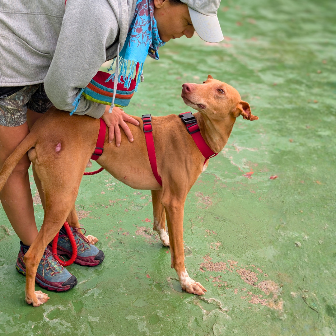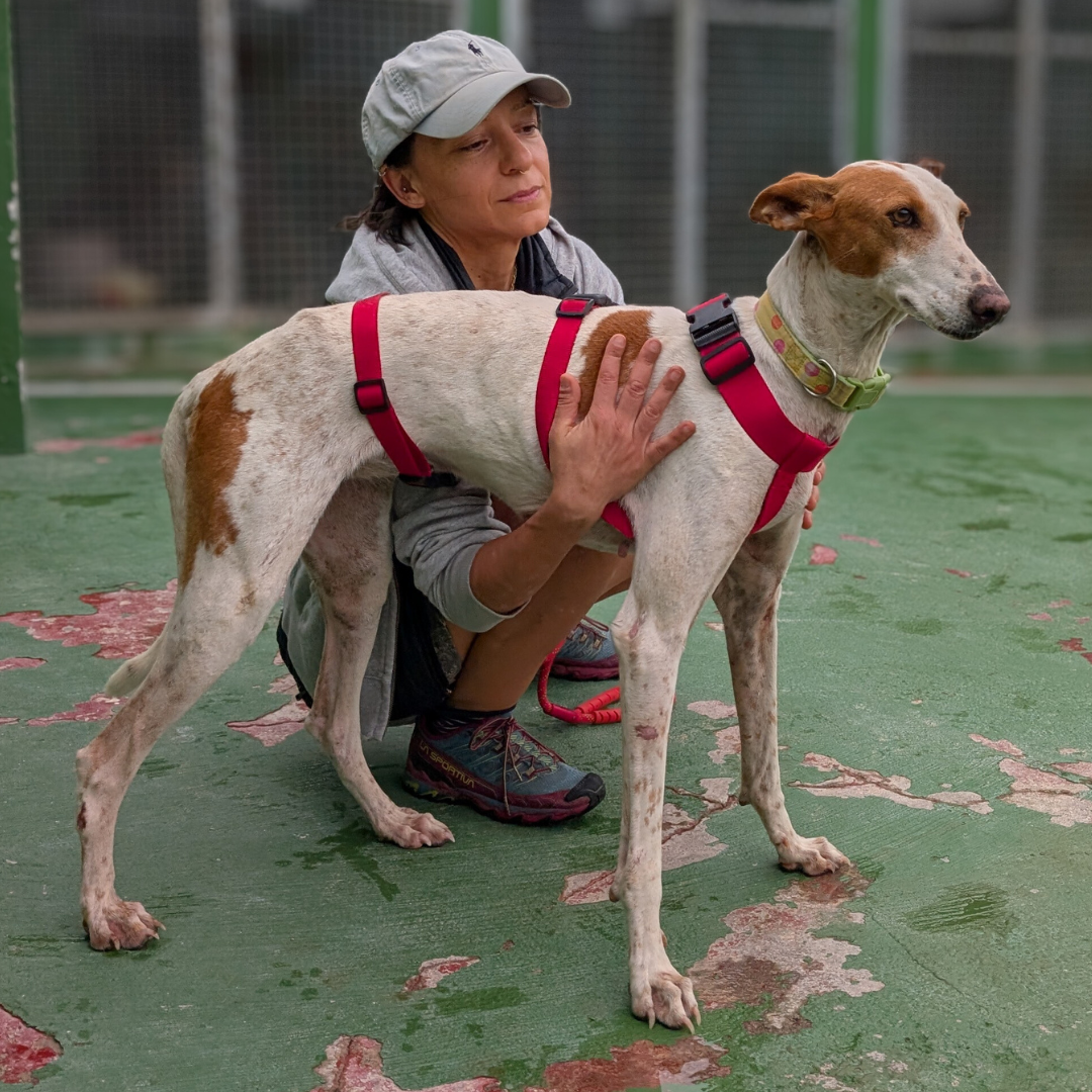 In soli 3 anni di vita, questa podenca ha vissuto tutta la sofferenza della sua razza: abusata, sequestrata insieme ad altri cani maltrattati, ha trascorso oltre un anno in un canile affollato aspettando il processo che l’avrebbe finalmente liberata. Durante questo periodo è stata anche aggredita e ha perso metà della coda.
