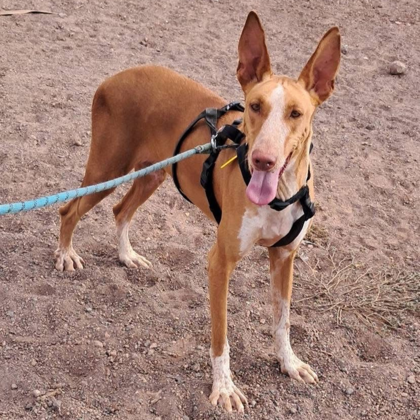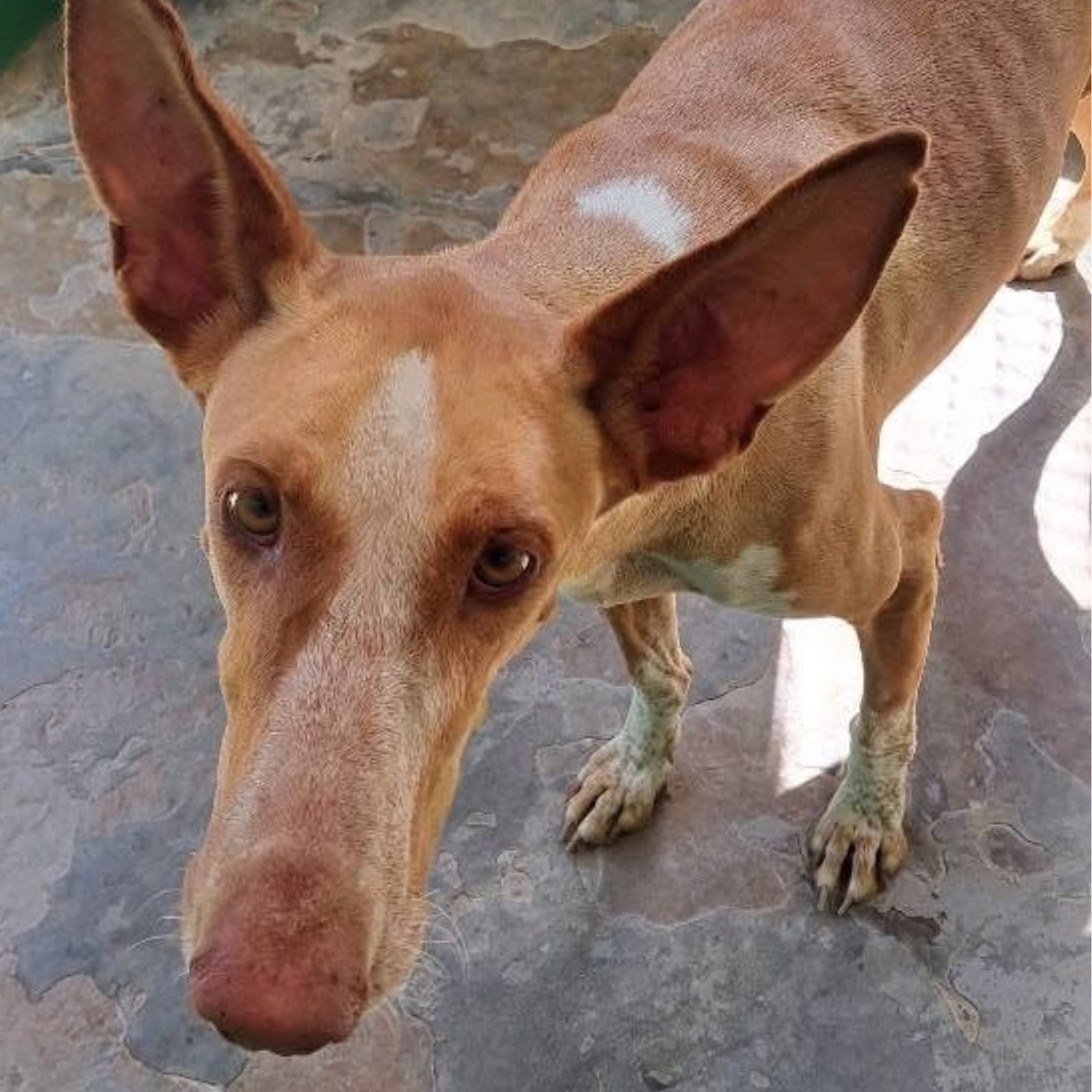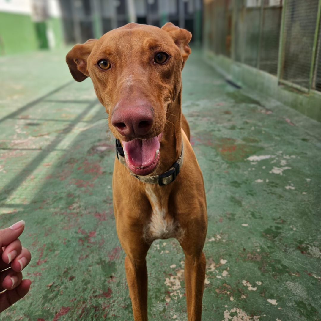 Fefo è un magnifico Podenco taglia XL, alto 72cm. Ha cinque anni e probabilmente le orecchie più grandi di tutto il rifugio. Fortunatamente, ha un temperamento molto buono e passeggiare con lui è un piacere. I Podenchi maschi e di taglia grande sono i più svantaggiati, nonostante questo speriamo di trovargli presto una famiglia per sempre.
